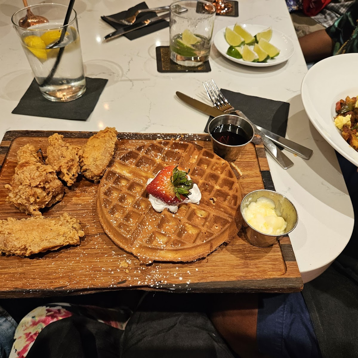Good vibes, great food and great service. I see why they are highly rated. The inside of the restaurant is very clean. They do play nice r&b music at just the right volume level where you are still able to have a conversation with the people around you. The food comes out fast and the servers are attentive. Automatic 20% gratuity regardless of party size but that wasn’t a big deal. I do recommend the wings and oxtail hash. We also had the sweet potato chicken and waffles which were good. Mimosas were also good as well. Desert menu is solid with plenty of options. Overall great experience and glad that we came